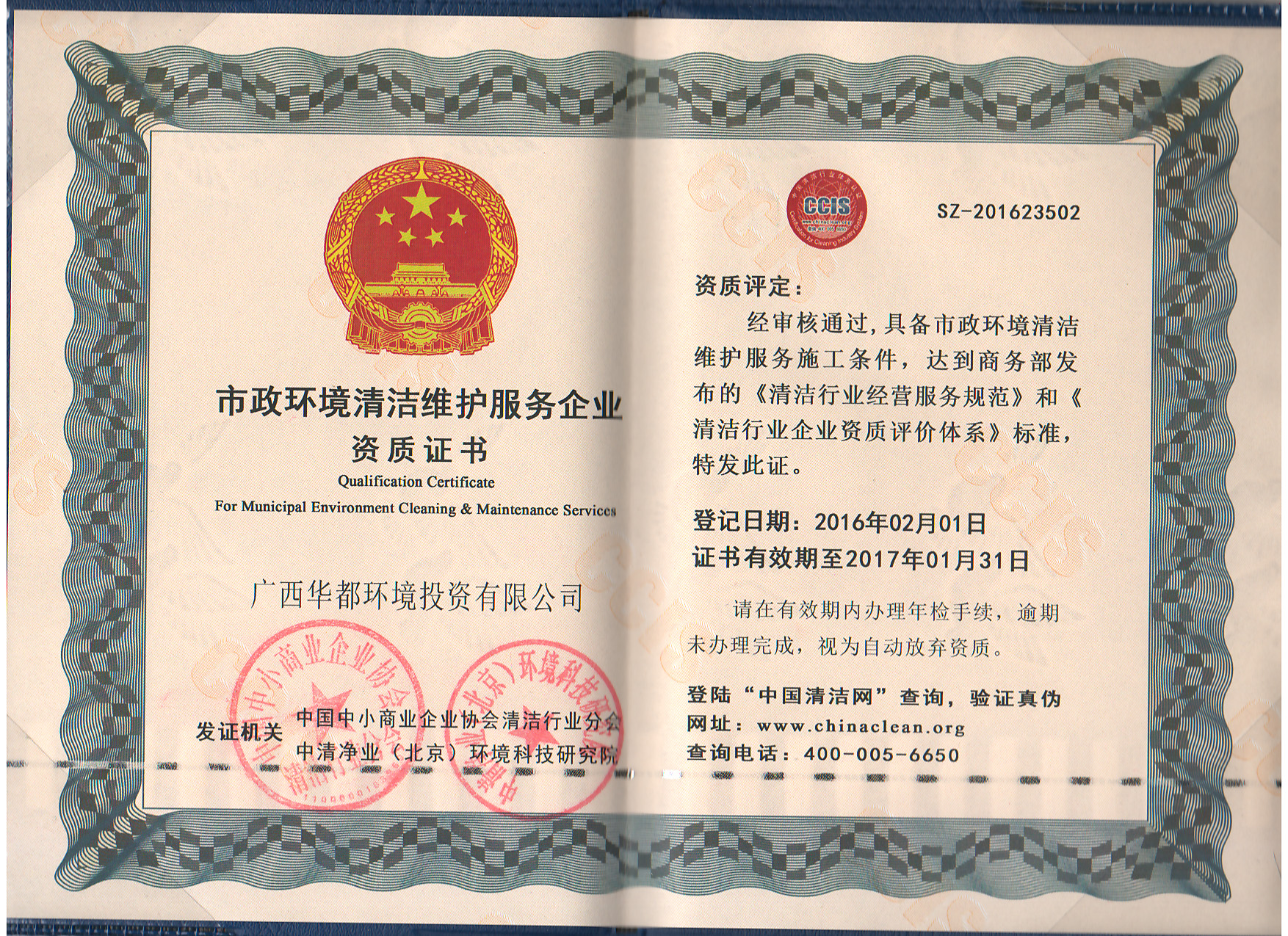 市政環(huán)境清潔維護服務企業(yè)資質證書